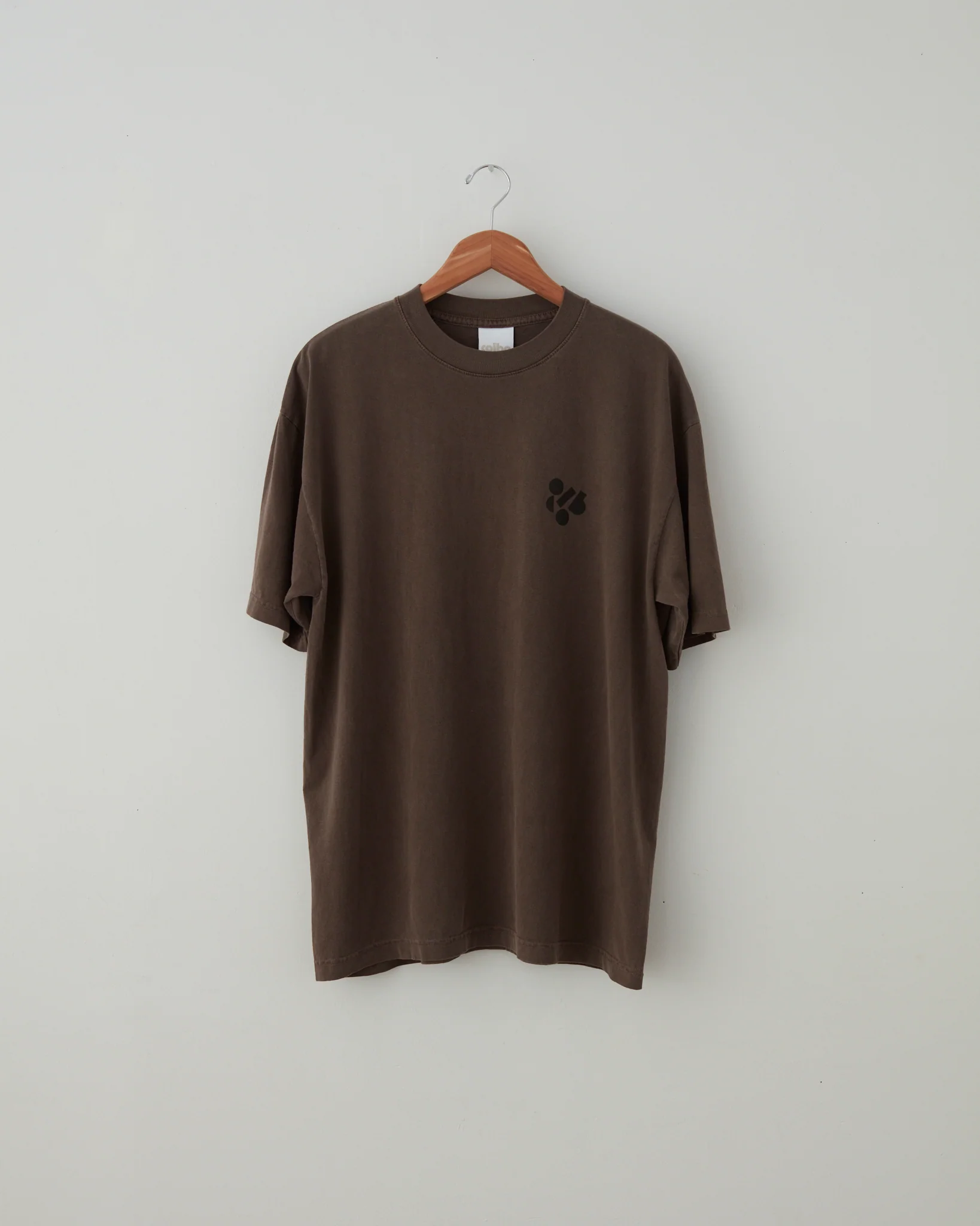 Classic garment dyed 6.5 Oz T-Shirt in washed brown. Featuring a front left chest print with scattered shapes of our logo in black.